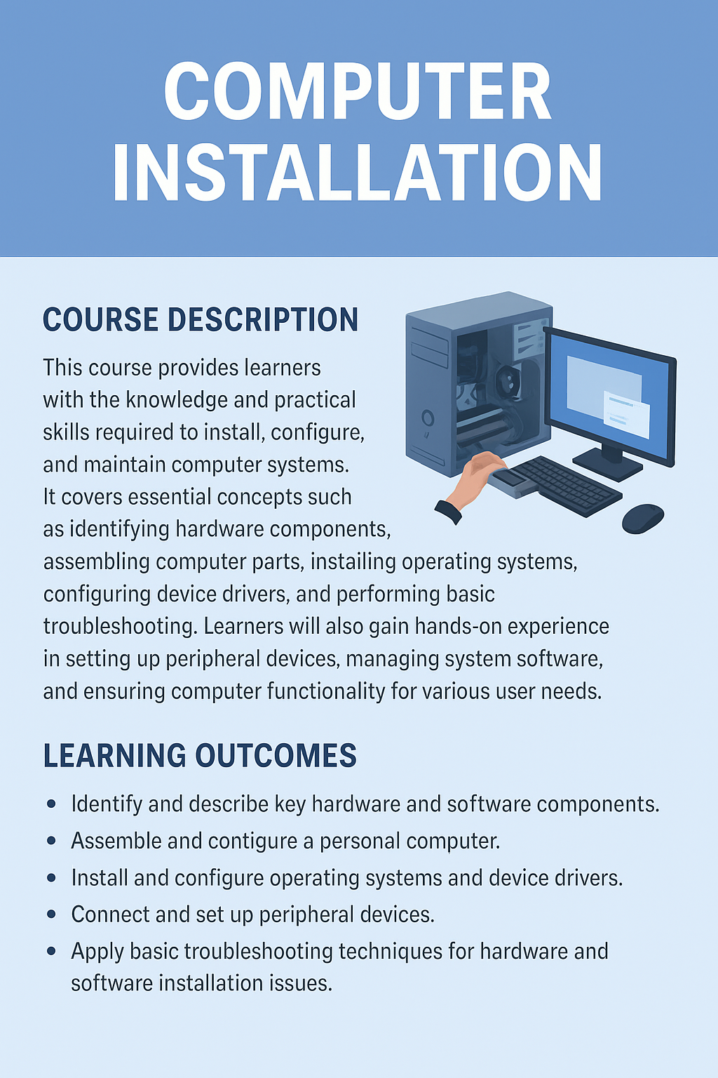 This course provides learners with the knowledge and practical skills required to install, configure, and maintain computer systems. It covers essential concepts such as identifying hardware components, assembling computer parts, installing operating systems, configuring device drivers, and performing basic troubleshooting. Learners will also gain hands-on experience in setting up peripheral devices, managing system software, and ensuring computer functionality for various user needs.